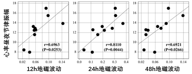 注:宇航员心率的昼夜节律振幅与地磁偏角的12、24和48小时波动之间呈现正相关,关联强度分别为12h(r = 0.6963,P = 0.0253)、24h(r = 0.8110,P = 0.0044)和48 h(r = 0.6921,P = 0.0266)。