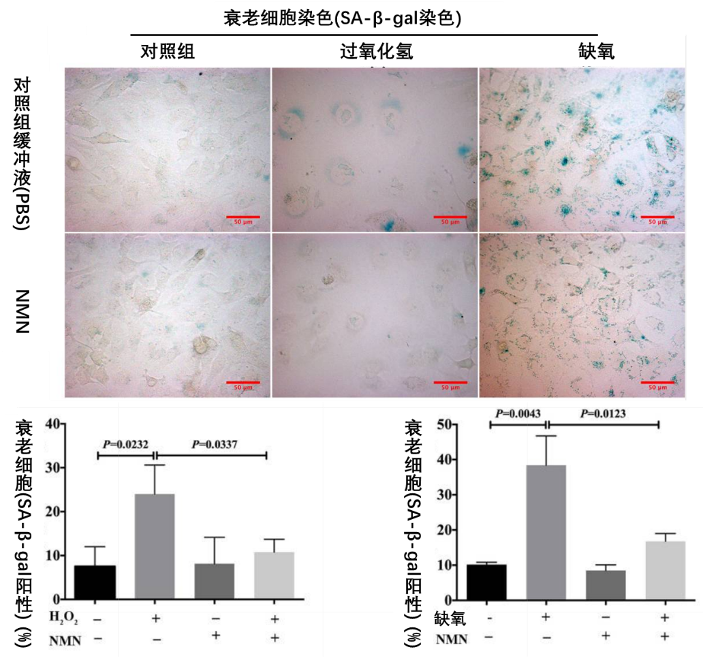 在受到过氧化氢(H2O2)或缺氧的处理后,细胞会进入一种老化的、不增殖的状态,称为细胞衰老。而补充NMN可以减轻细胞衰老。