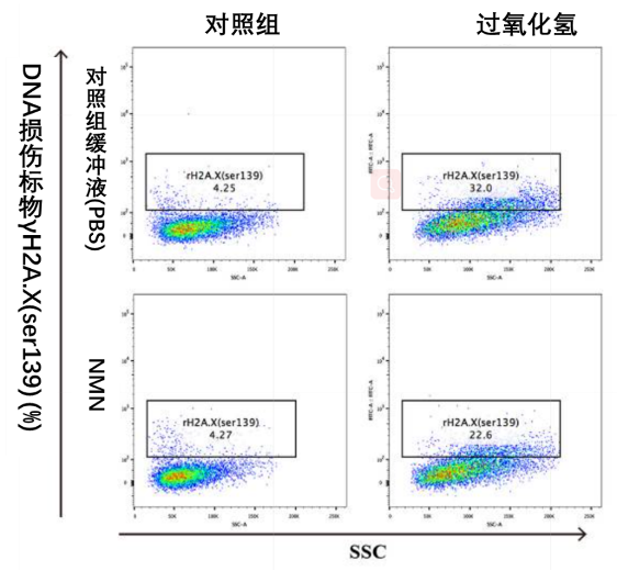 在过氧化氢诱导的肾脏细胞损伤模型中,补充NMN可以使DNA损伤细胞的比例从32%显著降低到22.6%。