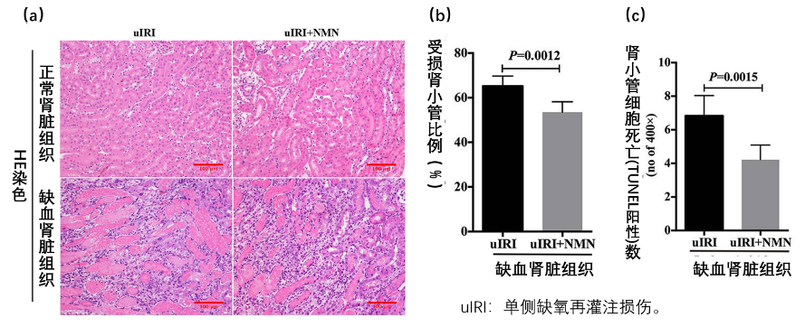 在缺血缺氧诱导的肾脏瘢痕组织中,(b)图显示补充NMN显著降低了受损的肾小管(肾脏的微小结构)比例,(c)图显示NMN显著降低了死亡细胞的百分比。