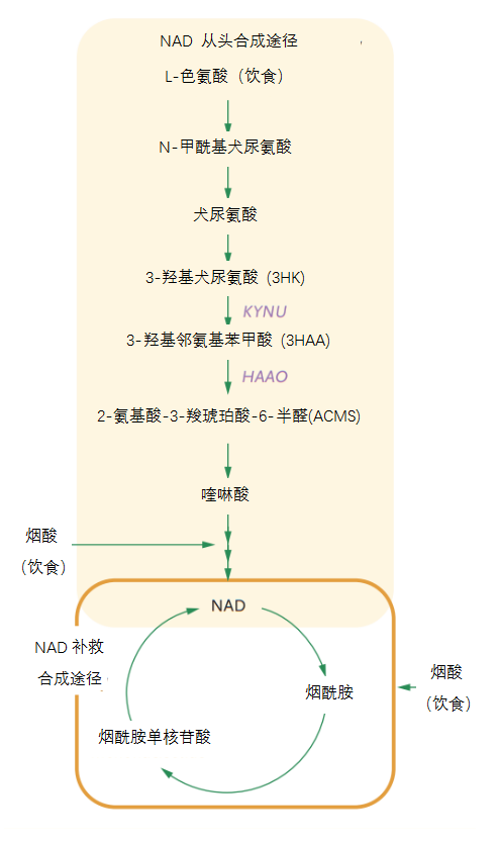 生物学家Dunwoodie及其同事在研究中还发现,患有NAD+缺乏症的孕妇如果在怀孕期间补充适当的NAD+前体和维生素B3,将会大幅度降低婴儿畸形的发病率。这可能与维生素B3参与NAD+合成过程有关[3],详见图2。